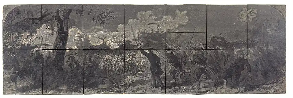 The 5th New York Infantry was replaced for one last assault on the Union right by Major Winthrop, who was also an officer of the 7th New York Infantry but was serving on the staff of General Peirce, having been detailed from General Butler's staff since he helped Butler plan the attack. Winthrop led a detachment of troops from the 5th New York, 1st Vermont, and 4th Massachusetts infantry regiments.[73] Though very tired from the night march and increasingly hot day, Winthrop and his force attempted to turn the Confederate left flank (from the Union right). Unlike the earlier unsuccessful Union attempts to cross the creek, Winthrop and his men crossed the creek uncontested because they tied their white cloths around their hats and pretended to be part of the Confederate force. Then they cheered and ran forward, somewhat prematurely giving away their identity. Two companies of the 1st North Carolina Infantry then turned to face them and their fire turned the Union force back with several casualties. One was Major Winthrop who had jumped onto a log and yelled "come on boys, one charge and the day is ours." These were his last words as he sustained a bullet through his heart while his men fled back across the creek.[74] After the battle, Colonel Hill praised Winthrop's courage while disparaging the efforts of the rest of the Union soldiers.[75]