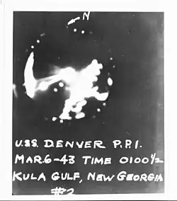 Radar-controlled gunnery was in its infancy as a technique and there was a tendency for the initial barrage to fall on the same, usually nearest, target. In earlier naval battles in the Pacific, this tactical deficiency had allowed the Japanese to successfully engage attacking U.S. ships with torpedoes and had resulted in several losses for U.S. forces previously.[4][9] In this case, the entire opening salvo straddled Murasame. As Minegumo's captain began passing orders to his crew, Murasame was hit by the sixth salvo of American gunfire, which was followed shortly afterwards by a salvo of five torpedoes that had been fired by the destroyer Waller. At around 01:15, one of these torpedoes hit Murasame, which exploded, caught fire and eventually sank. The explosion was reportedly heard by Briscoe's force about 25 miles (40 km) away around Munda.[10] The U.S. cruisers then rapidly shifted target, doing so before Minegumo could release any torpedoes.[9]