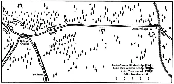 The Battle of Bolshie Ozerki was a major engagement fought during the Allied North Russia Intervention in the Russian Civil War. Beginning on March 31, 1919, a force of British, American, Polish, and White Russian troops engaged several Red Army partisan regiments at the village of Bolshie Ozerki. Although the initial Allied attacks were repelled, the outnumbered Allies managed to repel the Soviet flanking attempts that followed and the Red Army was later ordered to withdraw. Allied forces began to withdraw rapidly from northern Russia shortly thereafter.[1][2]