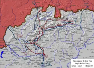After the aforementioned diversion, the task of the Upper Danube Corps was to retreat through the mining towns (Kremnica (Körmöcbánya), Banská Štiavnica (Selmecbánya), Banská Bystrica (Besztercebánya), Nová Baňa (Újbánya), Pukanec (Bakabánya), Ľubietová (Libetbánya), Banská Belá (Bélabánya), Brezno (Breznóbánya) to the region of the Upper Tisza.[2] The final goal was the concentration of the Hungarian troops at the region of the Upper and Middle Tisza: after the evacuation of Bácska and Bánság, General Antal Vetter calculated that 50,000 soldiers could be concentrated between Tokaj and Szolnok. After the retreat from the capital, Görgei turned north from Vác.[3] Windisch-Grätz sent a corps of about 12,000 men in pursuit of Görgei's troops only on 7 January entrusting Lieutenant-General Anton Csorich with the pursuit.[4] After the occupation of Vác, Csorich continued to follow the Upper Danube Corps with about 7,000 men. From Komárom, about 3,000 troops moved against the Görgei's corps, while Lieutenant General Christian Götz threatened the mining towns from the north.[4]
