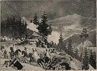 Guyon led the column attacking from the front, and, as he did not speak Hungarian well, he addressed the following speech to them, interspersing Hungarian and German words: Vorwärts dupla lénung, rückwärts kartács schiessen.[10] Which in English means something like: “If you go forward, you get double pay, if you retreat, I'll receive you with grapeshots”'.[10] However the attack led by the 33rd Honvéd Battalion was soon repulsed, because the Hungarian cannons, positioned near Korotnok, could not be effectively support the infantry, being on a much lower ground than the attacking soldiers.[8] When the Honvéds retreated, they found themselves confronted by Guyon's cannons, who fulfilled his vow and fired into them,[10] leaving one officer and 10 soldiers dead or wounded.[12] Guyon's center was then contented with a stationary artillery duel until the columns sent against the enemy's right and left and partly in its rear, appeared on the mountaintops surrounding the pass.[8] Then, at about 3 p.m., the 33rd Honvéd Battalion renewed its attack, but this did not go smoothly either.[8]