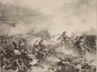 Between six and seven o'clock, Horn made his last cavalry charge against the enemy. Hepburn's brigade led an infantry attack, and the King sent the Blue Brigade to support him.[46][58][59] These two-fold attacks, coupled with the destructive crossfire from the Swedish artillery, finally led to the collapse of Tilly's army. The Imperial-League tercios suffered heavy losses and lost all cohesion. The remnants of Tilly's army was thus forced into a disorderly retreat. The regimental commanders Erwitte, Caffarelli and Philipp Pappenheim where killed during this action, while Coronini became a Swedish prisoner of war. Thus both Erwitte's reserve cavalry and Philipp Pappenheim's regiment fell apart and fled in panic from the battlefield.[55][57][48]