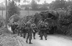 At 02:00 on 13 June the 13th/18th Royal Hussars squadron arrived at 'C' Company's position at the crossroads, later followed by fifty-one men from the 22nd Independent Parachute Company.[35] Bréville was now in British control again for the third time since the landings on 6 June. But there were too few to defend against a German counter-attack, so the 1st Battalion Royal Ulster Rifles, part of the 6th Airlanding Brigade, was moved into the village to take over from the survivors of the attack.[36]