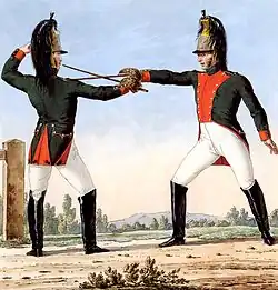 On 25 March, Long hurled the 13th Light Dragoons (two and a half squadrons) at the 26th Dragoons (three squadrons), with the Portuguese 7th Dragoons (two weak squadrons) covering their left flank. The French dragoons were broken and their commanding officer, General Chamorin, was killed. The whole French cavalry covering force of six squadrons - two remained in support of the infantry - was routed and fled in the direction of Badajoz. The historian Sir John Fortescue wrote, "Of the performance of Thirteenth, who did not exceed two hundred men, in defeating twice or thrice their numbers single-handed, it is difficult to speak too highly."[5] The British horsemen, followed by the 7th Portuguese Dragoons under Loftus Otway, embarked on a wild pursuit of the defeated Frenchmen. They came upon the convoy of 18 siege guns, overran it, and continued on for 11 kilometres (6.8 mi). Incredibly, some of the Light Dragoons charged onto the glacis of the Badajoz fortress and were repulsed by its fire. French cavalry emerged from the city to drive away the allied horsemen. Beresford, who had been given an erroneous report that the 13th LD had been captured in its entirety, called off the action when two of his cannon had just opened fire on the French column, the British heavy cavalry were within striking distance and British infantry were coming up.[6][7] Beresford's decision to call off his troops when they appeared to be in a position to destroy or force the surrender of the entire French column was taken by his detractors as an early sign of the lack of military insight he was to show later in the campaign at the Battle of Albuera.[8]