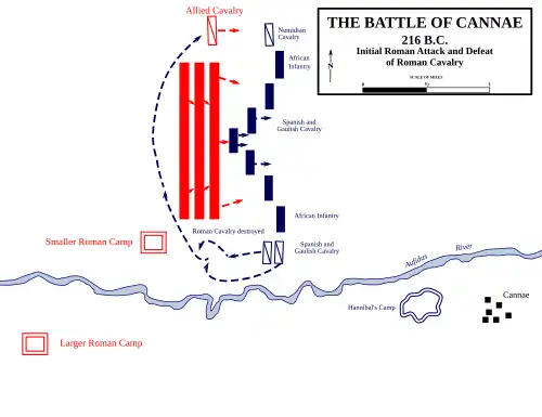 The battle began with a fierce cavalry engagement on the flanks.[64] Polybius described many of the Hispanic and Celtic horsemen facing the Romans dismounting due to the lack of space to fight on horseback, and called the struggle "barbaric" in the sense of its utter brutality.[65] When the Carthaginian cavalry got the upper hand, they cut down their Roman opponents without giving quarter.[66][15] On the other flank the Numidians engaged in a way that merely kept the Roman allied cavalry occupied.[66] Hasdrubal kept his victorious Hispanic and Gallic cavalry under control and did not chase the retreating Roman right wing.[66] Instead, he led them to the other side of the field to attack the socii cavalry still fighting the Numidians.[67] Assailed from both sides, the allied cavalry broke before Hasdrubal could charge into contact and the Numidians pursued them off the field.[15][67]