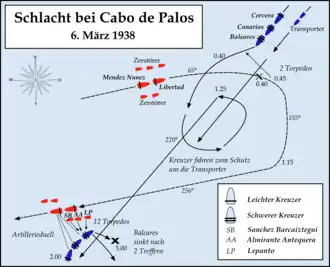 On March 5, 1938 the two Nationalist heavy cruisers, Canarias and Baleares, led by Vice Admiral Manuel Vierna Belando sortied from the naval base at Palma de Mallorca, in company with the light cruiser Almirante Cervera, and three destroyers. The squadron acted as a distant escort of a convoy bearing war equipment from Italy as well as troops from the Army of Africa being ferried across the Strait of Gibraltar.[2]