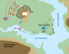 Abercrombie held a war council that evening. The options he presented to his staff were limited to asking if the next day's attack should be in three ranks or four; the council opted for three.[43] Abercrombie's plan of attack omitted Clerk's recommendation to fortify the summit of Rattlesnake Hill; in addition to the frontal assault, 4 six-pound guns and a howitzer were to be floated down the La Chute River and mounted at the base of Rattlesnake Hill, with 20 bateaux of troops to support the effort.[44]