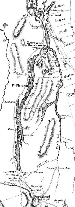 To the north of the fort was a road going to Fort St. Frédéric. To the west was a low rise of land, beyond which lay Mount Hope, a rise that commanded part of the portage trail, but was too far from the fort to pose it any danger.[8] The most serious geographic defect in the fort's location was Mount Defiance (known at the time of this battle as Rattlesnake Hill, and in the 1770s as Sugar Bush), which lay to the south of the fort, across the La Chute River. This 900 foot (270 m) hill, which was steep and densely forested, provided an excellent firing position for cannon aimed at the fort.[9] Nicolas Sarrebource de Pontleroy, Montcalm's chief engineer, said of the fort's site, "Were I to be entrusted with the siege of it, I should require only six mortars and two cannon."[10]