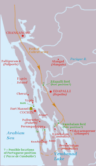 The exact location of the Passe de Cambalão, the fording point where Duarte Pacheco Pereira made his stand, is uncertain and disputed in various sources. Portuguese Cambalão is probably modern Kumbalam on the elongated islands in the middle-southern part of the Vembanad lagoon – that is below Cochin city. However, some historians (e.g. Logan (1887), Whiteway (1894), Monteiro (1989)) suggest the Portuguese made their stand much further north, at the ford of Edapalli (Portuguese Repelim), the same pass which Narayan fruitlessly tried to hold the previous year. There are reasons to justify either location and doubt the other.