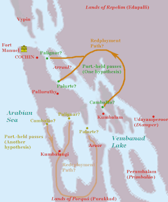 The chronicles suggest that the passages went via the island of Arraul (or Darraul or Arrail). This could be a reference to Aroor, a southerly peninsula, that indeed might be crossed north towards Palluruthy. Of course, this would require us to consider the location of the original 'Cambalão' to be Kumbalangy (rather than Kumbalam). This is not outlandish – as Aroor is indeed behind Kumbalangy and it does accord with occasional suggestions (e.g. Castanheda, p. 228) that the main encampment of the Zamorin's army between these assaults were in the 'lands of Porquá' (probably Purakkad, thus a reference to the southern end of the Vembanad lagoon).