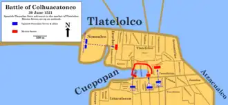 The Battle of Colhuacatonco[3] was fought on 30 June 1521 during the late stages of the Siege of Tenochtitlan between Spanish-Tlaxcalan forces and the Mexica Empire (also typically referred as Aztec Empire). It is regarded as the most important victory achieved by the Mexica during the siege.[4]