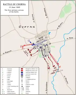Kmety departed from Pápa on 12 June, and after his troops arrived at the destination, crossing the Rába river at Malomsok,[23] they started the attack on 13 June at dawn.[19] He had his sappers make two bridges in order to secure his troops' retreat if needed, and left a hussar company in Marcaltő.[23] The Hungarian troops at Szilsárkány, which prepared to attack from the south, stumbled on an imperial patrol made of lancer cavalry (Uhlans) and captured one of them, but the others rode away. So it was a real danger, that Wyss and the Austrian troops around Csorna would be informed about the coming Hungarian attack. Kmety sent the cavalry of the Hungarian column which he wanted to send to Farád to cut the way of the imperials and their envoys towards Kapuvár.[24] At Szilsárkány, Kmety divided his troops for the attack. He sent the Lieutenant-Colonels Emil Üchritz and László Pongrácz to lead the 10th, 23rd, and 33rd Honvéd battalions with five companies of Vilmos (Wilhelm) Hussars and the 9th cavalry battery to the enemy's rear, on the route: Bogyoszló — Jobbaháza — Farád. He himself, with the 45th and 2nd Honvéd battalions, 2 jaeger companies, 2 companies of Nádor Hussars, an infantry battery, and 2 Congreve rocket launching racks marched through Szilsárkány and Pásztori to Csorna.[24] So he planned to attack Csorna from three directions.[19]