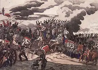 At this moment two companies of the Nádor-hussars arrived on the scene (north-east from the cemetery) of the place where the Vilmos Hussars and the Austrian uhlans fought with each other, and the uhlans were ready to retreat with Wyss's baggage towards Bősárkány. The Nádor hussars were formerly at the southern end of the town, but it seems that after the unsuccessful actions of the Vilmos-hussars, they came here and started an attack against the uhlans, then withdrew in a feigned retreat, and at a proper moment counterattacked, taking the uhlans by surprise, and pushed them on the Hungarian infantry lines, inflicting heavy losses. However, the hussars too had great losses, and in the end, the remaining uhlans managed to secure the retreat of the baggage towards Bősárkány.[28] The encounter of the hussars with the uhlans was described by the writer, historian, former revolutionary Alajos Degré, then a Hussar captain, with words of praise: The cavalry charge at Csorna was also amazing when the Emperor's Uhlan Regiment, the most famous cavalry [unit] of the Austrian army, arrived from Italy and asked to be sent against the Nádor Hussars, and they went toe-to-toe in wheat up to the horse's breast. [Captain] Dénes Dessewffy was stabbed with a lance in the stomach which came out through his back. He was saved from death by the fact that he had not eaten for thirty-six hours [...] Four times the Nádor-Hussars repulsed the Uhlans, who lined up for the fifth time to fight. At this fifth engagement, the divisions of both sides were now commanded by non-commissioned officers, as all the senior officers were [wounded or dead] on the ground.[16] The memoirs of Major Ferenc Karsa add to this: It was also interesting that the Nádor hussars [...] rushed to attack [over and over] in small groups without waiting for the command. In order to curb this, platoon commander D. issued the order of the day, "Whoever gets his sword bloodied before mine gets twenty-five sticks" [beating].[16] Kmety in his post-battle, among other soldiers, nominated for the 3. class order of merit two men from the 12. (Nádor) Hussar Regiment: Captain Dénes Dessewffy, for continuing to participate in the fight with his hussars even after taking 2 severe lance-wounds, and the hussar József Balla-Rigó for single handedly repulsing the attack of 8 Austrian uhlans.[34] At the end of the fight, 92 Austrian Uhlans were dead or wounded, while the Hungarian Hussars had only 31 (according to other sources 36) casualties.[35]