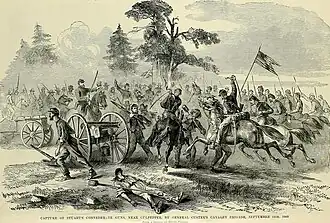 At 4 a.m. the following day, Pleasonton's three divisions moved forward nearly two miles, fording the Hazel River and approaching Culpeper. Advancing in three columns, the Union troopers drove off scattered Confederate pickets and skirmishers. Near the main Confederate defensive line at 1 p.m., 1st Division commander Brig. Gen. H. Judson Kilpatrick ordered a mounted charge by the Michigan Brigade of Brig. Gen. George Armstrong Custer, which carried the Confederate position centered at the railroad depot. Custer seized more than 100 prisoners, as well as three artillery pieces. The three columns converged at Culpeper and continued their advance, driving the Confederates towards the Rapidan River in heavy skirmishing. At nightfall, the victorious Federals encamped near Cedar Mountain, with the Confederates across Raccoon Ford on the Rapidan. Maj. Gen. Gouverneur K. Warren's II Corps occupied Culpeper Court House, although his infantry took no part in the cavalry skirmishing.[2] Probing actions the next two days indicated the new Confederate position across the Rapidan was too strong to carry.