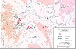 At 09:43 on 19 November, the three companies (330 men) of 2/503rd moved into jumpoff positions from which to assault Hill 875 (14°34′44″N 107°35′42″E / 14.579°N 107.595°E).[14]: 237 Companies C and D moved up the slope followed by two platoons of Company A in the classic "two up one back" formation utilized since World War I. The Weapons Platoon of Company A remained behind at the bottom of the hill to cut out a landing zone. Instead of a frontal assault with massed troops, the unit would have been better served by advancing small teams to envelop possible PAVN positions and then calling in air and artillery support.[2]: 254