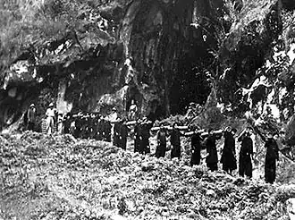 On 8 May, the Viet Minh counted 11,721 prisoners, of whom 4,436 were wounded.[13] This was the greatest number the Viet Minh had ever captured, amounting to one-third of the total captured during the entire war. The prisoners were divided into groups. Able-bodied soldiers were force-marched over 600 km (370 mi) to prison camps to the north and east,[112] where they were intermingled with Viet Minh soldiers to discourage French bombing runs.[113] Hundreds died of disease along the way. The wounded were given basic first aid until the Red Cross arrived, extracted 858 prisoners, and provided better aid to the remainder. Those wounded who were not evacuated by the Red Cross were sent into detention.[114]