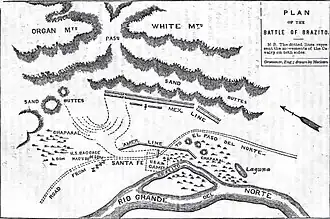 En route to Chihuahua, Doniphan's regiment was attacked by a Mexican army about thirty miles from El Paso del Norte and about 9 miles south of Las Cruces, New Mexico, at Bracito or Brazito on the Rio Grande.[2]: 152  Since it was Christmas, Doniphan had halted his men's march at 1 PM that day.[2]: 152  However, they spotted the dust cloud of a Mexican scouting party to the south and Colonel Doniphan promptly ordered his men to prepare for battle.[2]: 152