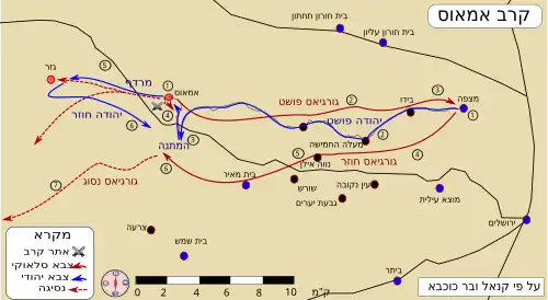 The Battle of Emmaus took place around September 165 BC during the Maccabean Revolt between Judean rebels, led by Judas Maccabeus (Judah Maccabee), and an expedition of Seleucid Empire forces under generals Gorgias, Ptolemy the son of Dorymenes, and Nicanor near Emmaus. The battle was won by the Maccabee rebels, who marched by night and surprised the Seleucid camp while many soldiers were absent. The victorious Maccabees looted the Greek camp for valuables and likely weapons to help further their cause.