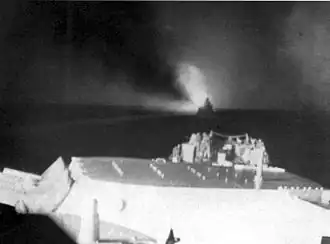 ![]() View forward from the US light cruiser Columbia towards the US light cruiser Cleveland as both ships fire at Japanese warships during the battle | |||||||