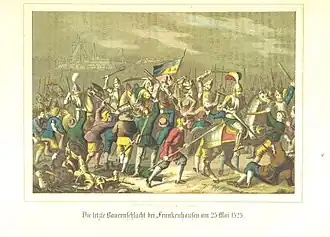 The Battle of Frankenhausen was fought on 14 and 15 May 1525. It was an important battle in the German Peasants' War and the final act of the war in Thuringia: joint troops of Landgrave Philip I of Hesse and Duke George of Saxony defeated the peasants under their spiritual leader Thomas Müntzer near Frankenhausen in the County of Schwarzburg.