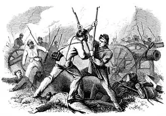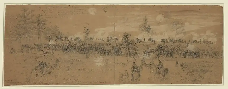 At 2 p.m., while Longstreet and A.P. Hill waited for the sounds of Huger's expected opening assault, Longstreet interpreted distant unidentified cannon fire as the signal to begin the coordinated attack. He opened upon McCall's line with his artillery, and McCall's artillery soon returned counter-battery fire.[11] Nearby, Lee, Longstreet, and visiting Confederate President Jefferson Davis were conferring on horseback when they came under heavy artillery fire (presumably blind fire from the Parrott rifles of McCall's Pennsylvania Artillery units), wounding two men and killing three horses. Hill, commanding in that sector, ordered the president and senior generals to the rear. Longstreet ordered Colonel Micah Jenkins to "silence" the Federal battery—an order he would later state he intended to mean the engagement of the cannoneers by sharpshooters, but which instead resulted in the overeager Jenkins ordering his brigade to charge the guns across the open field.[14] This action was soon followed by Longstreet's other brigades mobilizing along the line, which brought about a general fight around 4 p.m.[15]
