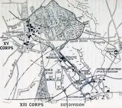 After taking over from XIII Corps in mid-August, Cavan held a meeting with the divisional commanders to discuss the next attack, at which it was stressed that it would take place along all of the Corps front and that supervision from above was not inconsistent with granting initiative to subordinates. The Corps General Officer Commanding Royal Artillery (GOCRA) was to decide the lines of barrages but liaise with divisions, which would work out the details. XIV Corps headquarters was to co-ordinate divisional plans, rather than dictate them, discretion by divisional commanders being retained within the corps plan, especially as command of the artillery reverted to divisions at zero hour. Observation posts were established with provision for telephone, visual and pigeon communication.[33] Guillemont was captured and held, German counter-attacks defeated and the ground consolidated in a rainstorm overnight. Operations against Ginchy from the south and towards Leuze and Bouleaux woods commenced.[34]