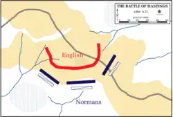 Harold's forces deployed in a small, dense formation at the top of a steep slope,[84] with their flanks protected by woods and marshy ground in front of them.[88] The line may have extended far enough to be anchored on a nearby stream.[89] The English formed a shield wall, with the front ranks holding their shields close together or even overlapping to protect from attack.[90] Sources differ on the exact site at which the English fought: some sources state the site of the abbey,[91][92][93] but some newer sources suggest it was Caldbec Hill.[89][84]