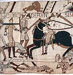 - ^ The first recorded mention of the tapestry is from 1476, but it is similar in style to late Anglo-Saxon manuscript illustrations and may have been composed and executed in England.[139] The Tapestry now is displayed at the former Bishop's Palace at Bayeux in France.[140]