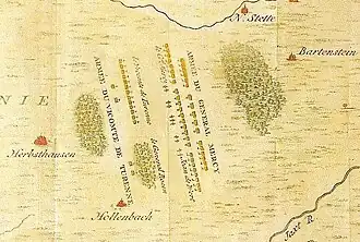 ![]() Battle of Mergentheim (“Mariendal” in the drawing), or Battle of Herbsthausen, of 1645. Plan of action, French depiction. | |||||||