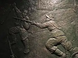 The Jangtae blocked most bullets, thus rendering the government's superior weapons useless. Moreover, Jeon placed the rebel army so that they would divide Yi Hakseung's troops into three separate divisions. Yi Hakseung ordered the troops to use their cannons, but they did not work because the pro-rebel villagers had put water inside the cannons (following the incident, rumours spread throughout the government forces that a ghost had destroyed the cannons).[3][4] Taking advantage of their confusion, the peasant army launched a fierce attack from behind.[1]