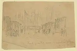 As the Union troops were rearranging their lines on June 21 in preparation for their mission against the railroad, they received a surprise visitor, President Abraham Lincoln, who had traveled by water and landed at City Point, Grant's newly established headquarters. He told Grant, "I just thought I would jump aboard a boat and come down and see you. I don't expect I can do any good, and in fact I'm afraid I may do some harm, but I'll just put myself under your orders and if you find me doing anything wrong just send me right away." After discussing strategy with Grant, Lincoln visited some of the VI Corps troops who would participate in the upcoming battle.[7]