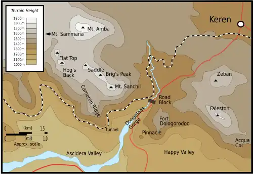 Keren was not fortified but it is surrounded on most sides by a jumble of steep granite mountains and sharp ridges which gave the defending forces on the high ground a distinct advantage. Control of the mountains provided the Italian artillery with perfect observation of an attack. The narrow Dongolaas Gorge at 15°45′34″N 38°25′16.8″E / 15.75944°N 38.421333°E through which the road and railway from Agordat to Keren passed was dominated on the south eastern side by the massif of Mount Zeban and Mount Falestoh on which stood the imposing defences of Fort Dologorodoc at 15°45′14.9″N 38°25′30.6″E / 15.754139°N 38.425167°E. The other side of the gorge was commanded by the mass of Mount Sanchil with a saddle of secondary summits, Brig's Peak, Hog's Back and Flat Top stretching north-westwards toward Mount Sammana. In front of the Sanchil feature on its south western side was a secondary ridge, feature 1616, which became known as Cameron Ridge, overlooking the Ascidera Valley and the railway line.[10]
