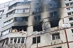 By 25 February, fierce fighting had broken out in the northern suburbs of the city, near the village of Tsyrkuny, where Ukrainian forces were able to hold against Russian forces.[54] Russian artillery barrages hit an apartment block in the city, killing a young boy.[55] On 26 February, Oleh Synyehubov, the Ukrainian Governor of Kharkiv Oblast announced a curfew and that non-military vehicles on the street would be "liquidated."[56]