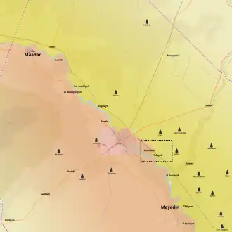 The US Central Command alleged that pro-government forces had "initiated an unprovoked attack against well-established Syrian Democratic Forces headquarters" in the area, while coalition service members were "co-located with SDF partners during the attack 8 kilometers (5 mi) east of the agreed-upon Euphrates River de-confliction line".[22][23][24] The Russian Ministry of Defence's statement, released on 8 February 2018, referred to the incident at the village of Salihiyah (located south of the SDF-held town of Abu Hamam in the Abu Kamal District) and said that it was caused by reconnaissance actions of Syrian militias that had not been cleared with the Russian operations command; the statement stressed that there were no Russian service members in the "designated district of the Deir ez-Zor province of Syria".[25][26]
