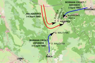 On 4 April, the Bosnian Croat TO captured Gornji Malovan.[32] At the same time, the Bosnian Croat TO received reinforcements from Posušje, as well as a company from Bugojno and Uskoplje each.[33] Fighting intensified as the JNA reinforcements arrived. A part of the Croatian reinforcements, which had just arrived from Bugojno and Uskoplje, fled after coming under attack near Zlosela. However, the JNA failed to achieve a breakthrough—even with five attack helicopters deployed in support of its advance towards Zlosela and Kupreška Vrata at 1:30 p.m.[34]