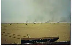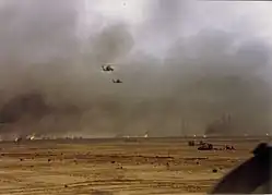 The Marines were assisted by the U.S. Army 2nd Armored Division's Tiger Brigade which was spearheaded by the 3-41 Infantry's Straight and Stalwart Battalion Task Force. The 2nd Armored Division's 3-41 Straight and Stalwart Battalion Task Force and the 1-3 Field Artillery Bn destroyed a large number of enemy vehicles and captured over 1,000 prisoners during combat operations. The 1st Tiger Brigade claims 181 destroyed or captured enemy tanks, 148 APCs, 40 artillery pieces, 27 AA emplacements, 263 Iraqi dead and 4,051 captured after 100 hours of combat.[21] The 2nd Marine Division lost 9 M60A1 tanks breaching the minefield.[6] One M1A1 tank, belonging to the 2nd Armored Division's Tiger Brigade, was also damaged by a landmine.[5] A pre planned counterattack by the 8th Mechanized Brigade of the Iraqi 3rd Armored Division attacked M1A1 tanks in the 2nd Marine Division's sector and was destroyed without loss, while the Marine 8th Tank Battalion destroyed other Iraqi tanks.[22] The Marine 3rd Tank Battalion destroyed an unknown number of Iraqi T-62 tanks around Al Jaber Airfield.[14] On the second day of the U.S. advance a platoon from the Marine 8th Battalion destroyed 13 Iraqi tanks in a battle near a defensive position known as the Ice Tray.[23] Marine and Navy air power then inflicted heavy casualties on retreating Iraqi forces leading north out of Kuwait City.[20] Later that night, some of the battles intensified as Marine forces surrounded the heavily defended Kuwait International Airport. U.S. Navy battleships offshore in the Persian Gulf pounded the airport hangars, terminals and other buildings, leaving them a shambles of twisted metal and blackened concrete in an effort to rout Iraqi forces from the field. Marine commanders said that cameras in remotely piloted aircraft that monitored the bombings showed Iraqis "literally jumping out of the tanks." After the Marines commandeered the critical airfield, Special Forces teams arrived to counter snipers and other pockets of resistance that remained entrenched around the large airport complex. While Marine and Special Forces personnel were actively securing the airfield, Air Force communications personnel arrived and setup tactical air traffic control and landing systems to replace systems damaged by retreating Iraqi forces.[24] Marines from Marine Air Traffic Squadron 38 established Approach ATC services and maintained service until civilian ATC returned.[25] The Marines lost 5 killed and 48 wounded in the three days of fighting, Marine officials said.[26] Marine M60A1 tankers had tallied impressive totals against the Iraqi armored forces. The 1st Tank Battalion claimed 50 Iraqi T-55 and T-62 tanks and 25 APCs. The 3rd Battalion claimed 57 T-55s and T-62s (plus 5 T-72s), 7 APCs, and 10 trucks. The 8th Battalion destroyed more than three dozen tanks and a number of other vehicles.[9]