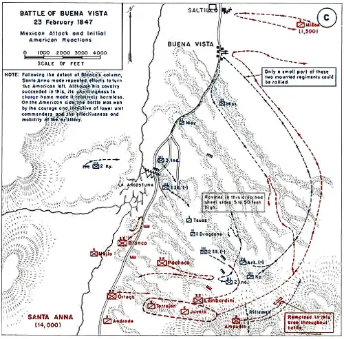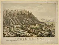 The Battle of Buena Vista (February 22–23, 1847), known as the Battle of La Angostura in Mexico, and sometimes as Battle of Buena Vista/La Angostura, was a battle of the Mexican–American War. It was fought between U.S. forces, largely volunteers,[3] under General Zachary Taylor, and the much larger Mexican Army under General Antonio López de Santa Anna. It took place near Buena Vista, a village in the state of Coahuila, about 12 km (7.5 mi) south of Saltillo, Mexico. La Angostura ("the narrow place") was the local name for the site. The outcome of the battle was ambiguous, with both sides claiming victory. Santa Anna's forces withdrew with war trophies of cannons and flags and left the field to the surprised U.S. forces, who had expected there to be another day of hard fighting.