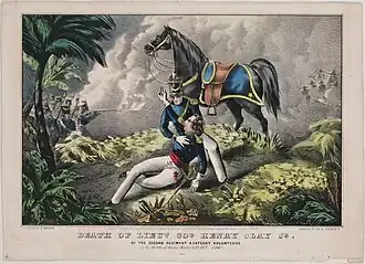 Recovery of the bodies of the U.S. dead was a phenomenon of this conflict. The most famous from Buena Vista/La Angostura was that of Henry Clay Jr., the third son of American statesman Henry Clay, a vociferous opponent of the Mexican War. His death was the subject of at least seven prints by Currier and Ives, and Neale and Pate, and others. The Currier and Ives print depicts him shortly after being wounded, urging his comrades to leave him to his fate.[20] The grave site became well known, with two surviving daguerreotypes recording it at different times of the day and from different angles.[21] Clay's body was disinterred and transported to the U.S. for burial by Jefferson Davis.[22] Also killed were Archibald Yell, former governor of Arkansas,[23] and John J. Hardin of Illinois, a Whig political rival of Abraham Lincoln.[24] The state of Kentucky paid for the retrieval and transport of some officers and enlisted men, who were subsequently buried in a common grave near the Kentucky State House in the capital Frankfort. There was a large public funeral on July 20, 1847, honoring the sacrifices of the dead Kentuckians, with John C. Breckinridge praising them. Breckinridge had been an opponent of the war, but volunteered shortly after his own patriotic speech.[25]
