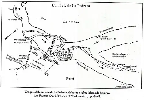 On July 10, the Peruvian commander Óscar Benavides demanded the withdrawal of the Colombian forces, the refusal caused the first confrontation between both parties. 111 Colombian soldiers from the trenches repelled the attack of four river gunboats with 100 men, and after two hours of combat, the breakdown of the river gunboat América gave rise to Benavides' withdrawal.[4] The next day, 23 Colombians managed to hold the position until the night. Thirty minutes before midnight, however, a new Peruvian attack was carried out which could not be successfully repelled by Gamboa.