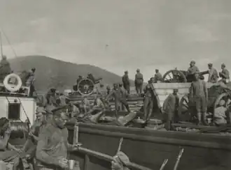 The Red Army forces defending the town were under the impression that the approaching ships were friendly vessels bringing in supplies. This allowed the ships to approach the harbor to a distance of approximately 4 kilometres (2 mi).[3] By the time the defenders of Mysovsk realized their error, it was too late. The ferry-icebreaker SS Baikal tried to initiate fire upon the Czechoslovak ships but they were faster. They began to fire, both at the Baikal and at the harbor. The Baikal was set ablaze and general confusion erupted in Mysovsk.[2][4] The train station was in flames. An armored train arrived after half an hour of Czechoslovak bombardment. Guns were offloaded from it and began to return fire upon the Czechoslovak ships. Since the main mission of destroying the harbor and train station were completed, the legionaries left the battle. On the return journey they met the enemy ship Angara which decided to evade battle. The rest of the journey was uneventful and they returned to Listvyanka without any further incidents.[3] The Baikal was run aground and left burning for some days before being towed and ultimately scrapped.
