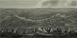 The Allies hastily constructed earthworks running between Laar and Neerwinden, containing 80 of their 91 pieces of heavy artillery.[25] While less effective against infantry attack or artillery bombardment, these provided protection from the superior French cavalry. In the centre, the open ground between Neerwinden and Neerlanden was solidly entrenched, with the village of Rumsdorp on the centre-left as an advance post. The left rested on Landen brook and was the hardest to attack.[26]