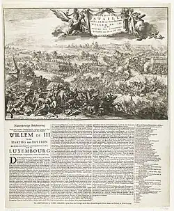 Maximilian commanded the Allied right, with the centre led by William himself, and Henry Casimir II the left. These were drawn up in conventional formation, with the infantry in front and cavalry to the rear.[27][6] Luxembourg concentrated his main assault force of 28,000 men against the Allied right, while his centre and right under Villeroy and Prince de Conti respectively conducted simultaneous attacks to prevent William reinforcing his right. A strong force of infantry and dragoons was designated to attack Rumsdorp.[28] In this formation his tightly packed French lines in the centre were, however, optimal targets for Allied artillery.[6]
