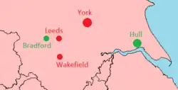 The small wool town of Leeds in the West Riding of Yorkshire, in what is now West Yorkshire, had both economical and tactical significance during the war. The cloth industry was critical for the area, and the finishing processes at Leeds was an essential part of that. Additionally, Leeds was located across the roads to York, Chester and Hull, controlling access to the food production in the Vale of York.[10] At the time, Leeds was predominantly built around a single street, Briggate, which ran down to the River Aire; branching off Briggate were Kirkgate and Boar Lane.[11] The town had a population of around 6,000.[12]