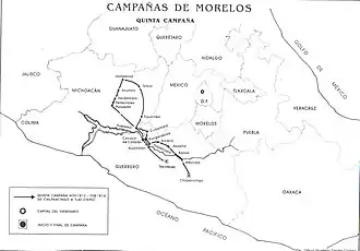 ![]() A map of the fifth and final campaign of José María Morelos, wherein the Battle of Lomas de Santa María took place. | |||||||
