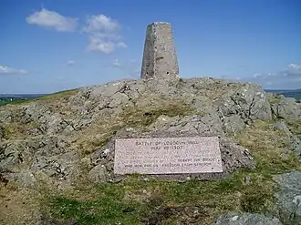 ![]() Trig Point and Battle Plaque at the summit of Loudoun Hill. Battle of Loudoun Hill, May 10, 1307, Through devotion and by willing hands this stone was hauled here to commemorate the first victory of King Robert the Bruce who won for us freedom from serfdom | |||||||