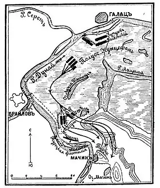 The Ottomans, at that time, also intended to attack Golitsyn's right flank and rear from Brailov with a landing force, which Repnin had predicted, but 2 artillery batteries of Major General Spaeth's detachment, left by Repnin for such an occasion, forced the Turkish vessels to withdraw, which lost 7 pieces with the help of Volkonsky and Golitsyn reinforcements.[7]