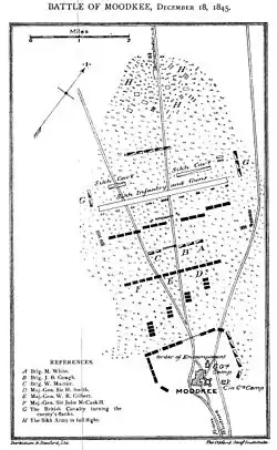 - ^ "On the evening of December 18 some 10,000 Sikhs with 22 guns led by Lal Singh attack 11,000 British under British commander in chief in India General Sir Hugh Gough, who has 42 guns. Because much of the Battle of Mudki takes place at night, it becomes known as Midnight Mudki. Gough and the British are victorious."[1]