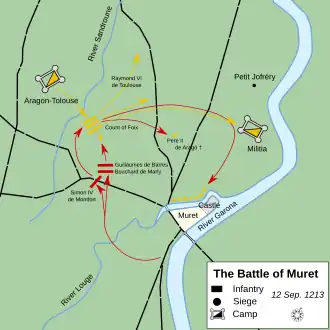 The Battle of Muret (Occitan: Batalha de Murèth), fought on 12 September 1213 near Muret, 25 km south of Toulouse, was the last major battle of the Albigensian Crusade and one of the most notable pitched battles of the Middle Ages. Although estimates of the sizes of the respective armies vary considerably even among distinguished modern historians, it is most well known for a small force of French knights and crusaders commanded by Simon de Montfort the Elder defeating a much larger allied army led by King Peter II of Aragon and Count Raymond VI of Toulouse.