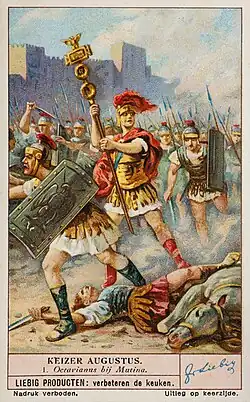 Octavian eventually managed to recover the consul's remains, but could not keep possession of the camps. In the end, his legions retreated from Antony's camp. At the culminating moment of the battle, Pontius Aquila was killed, and his troops, which had made a sortie out of the city, eventually returned to Mutina.[9] On the basis of the reconstructions of ancient historians it is difficult to know precisely the true course of the final clashes of the battle, with pro-Augustan accounts focused on exalting the role of Octavian and his courageous action to recover the body of the consul Hirtius.[11] Other sources cast doubts on the real actions of the young heir of Caesar; Suetonius[12] and Tacitus[13] report other versions that hint that Hirtius was even dispatched during the melee by Octavian himself in his eagerness to get rid of an uncomfortable political rival. The death of Pontius Aquila, a fierce opponent of the Caesarian faction, has also appeared suspect to some historians.[14]