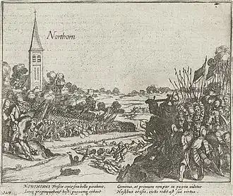 In the meantime, Verdugo aimed to block Niezijl's dike with Frate's and Bievres' companies, but as these troops lagged behind, he found himself alone on the dike when Norreys and his officers attempted to retreat back to their camp.[26] Alone, Verdugo fought desperately against them. Twice the Spanish commander was taken prisoner, but in the end, as he killed or wounded many of his foes, Norreys preferred to let him go free rather than risk allowing the pursuing Spanish troops to capture himself or his remaining men.[26] Once he had recovered, Verdugo massed some cavalry and completed the Anglo-Dutch defeat by destroying an English troop which, trying to save the flags, fled across a field towards the Niezijl canal.[26] Most of the English flags and all of their artillery were lost. As the night was falling, Verdugo collected his troops and returned to Noordhorn, where they formed into squadron formation and, kneeling down, prayed to thank God for their victory.[27]